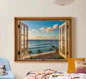 Let the sea breeze in with this enchanting view of a palm-fringed sandy beach at Waikiki Beach. This luminous design captures the perfect moment when the golden sky is reflected on the calm ocean. An invitation to get away from it all, to laze around and enjoy the tropical sunshine. Ideal for recreating a relaxing summer ambience, where every glance evokes holidays and the serenity of an endless horizon.