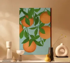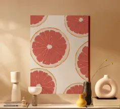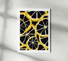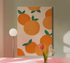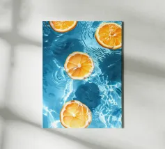 A graphic, pop art style pattern of orange slices against a dark blue background. The composition is modern, vibrant, and a fresh, zesty, and stylish design.