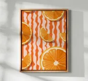 A vibrant, graphic pattern of repeating orange slices against a white and orange striped background. The composition is fresh, zesty, modern, and a cheerful celebration of citrus fruit.