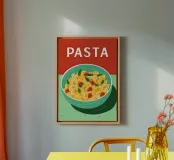 This charming illustration combines mid-century design with Mediterranean joie de vivre. The minimalist graphic style is reminiscent of classic advertising art from the 1950s, while the warm colour palette of tomato red and sage green radiates pure cosiness. The stylised pasta bowl becomes an appetising art object - perfect for the kitchen, dining room or restaurant. A nostalgic statement piece for lovers of Italian dining culture and timeless design aesthetics.