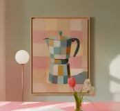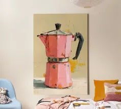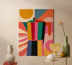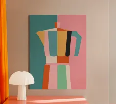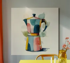 Elevate your kitchen decor with this distinctive canvas art featuring a charmingly designed patchwork moka pot. Ideal for coffee enthusiasts, this piece adds a vibrant touch to your home while making a perfect gift for housewarmings and special occasions.