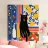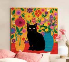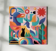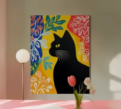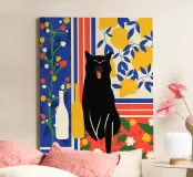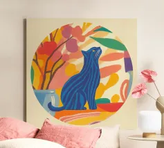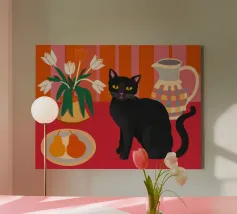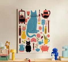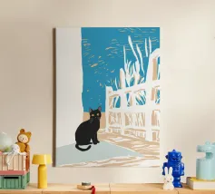This charming art print captures the whimsical essence of a cat's paradise, set amidst a backdrop of traditional tiles adorned with blooming flowers, zesty lemons, and rustic pots.