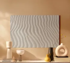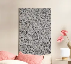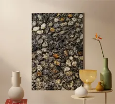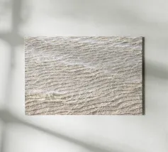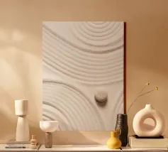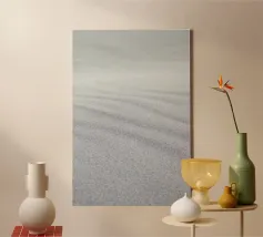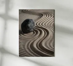 This work of art shows a delicate section of a Zen garden - a meditative composition of filigree pebble lines that run diagonally across the picture surface. The pebbles are fine, grey and evenly distributed, creating a calm, almost hypnotic pattern. Each line has clearly been drawn with care, the precision reflecting the idea of inner order and concentration.