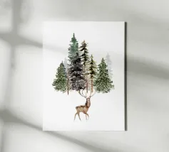 Dieses stimmungsvolle Aquarellbild zeigt vier detailreich gemalte Tannenbäume in verschiedenen Grüntönen – von sattem Waldgrün bis hin zu neblig-zartem Grau. Die natürliche Anordnung und die feine Pinselführung verleihen dem Motiv Ruhe, Tiefe und eine winterlich-märchenhafte Atmosphäre. Ideal für alle, die Naturmotive lieben und ihrem Zuhause eine sanfte Waldstimmung schenken möchten.