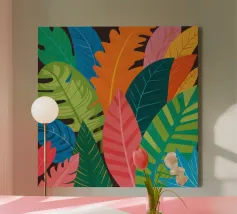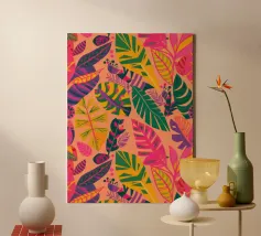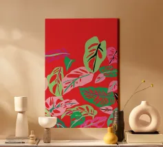 A modern, graphic pattern of large red and pink tropical leaves against a vibrant pink background. The composition is a bold, stylish, and beautiful piece of contemporary botanical design.
