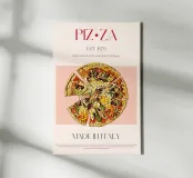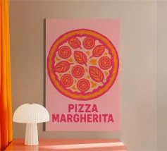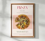 Set on a neutral, cream background, this elegant illustration of pizza adds sophistication to any kitchen, cafe or dining area. This minimalist yet informative design will spark conversation in any setting, adding a refined touch to your environment.