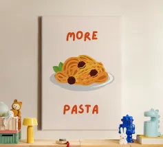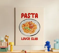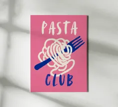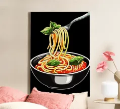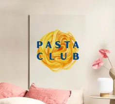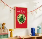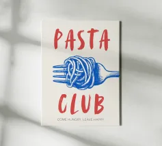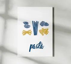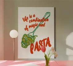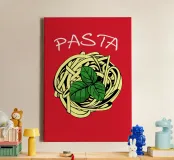 Tagliatelle on a red background with basil leaves and the word 'Pasta'