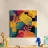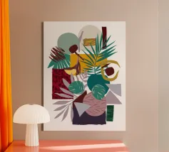 A bold abstract composition of stylized leaves and geometric shapes in primary colors of yellow, red, and blue, creating a vibrant and structured design.