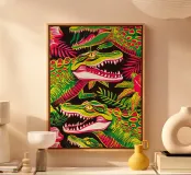 This explosive crocodile pattern combines jungle wildness with a psychedelic 60s aesthetic. The bright neon colours and organic shapes are reminiscent of Ed Hardy's tattoo art and tropical surf culture. Each reptile becomes a graphic work of art between dangerous fascination and pop art irony. The dense composition creates a visual frenzy - pure "visual overload" aesthetics. Perfect for anyone who loves the extraordinary: streetwear fans, tattoo enthusiasts or bold interior rebels. Guaranteed to be an eye-catcher!