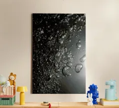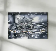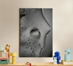 Droplets of water scatter across a sleek, reflective surface, capturing light in an abstract formation. This minimalist background offers a serene and calming vibe for mobile devices.