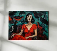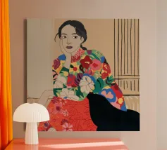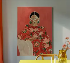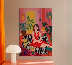 A woman in a red bird print robe sits in a patterned room holding coffee with a quiet yet graphic presence.