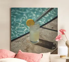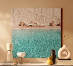 The photograph captures a serene moment on a sun-drenched rooftop in Marrakech, where the vibrant blue sky meets the tranquil waters of a polished, neutral beige-colored pool. A glass of crystal-clear water stands gracefully beside the pool’s edge, catching the sunlight, which reflects off the smooth surface of the water. The surrounding pool bath , with its warm, neutral tones, enhance the calm, minimalist elegance of the scene.