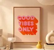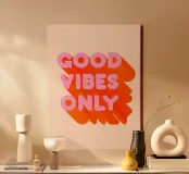 Start your day with positive energy! This "Good Vibes Only" typography art print features retro-inspired lettering in vibrant pink and orange hues, popping against a soft peach background. It's a cheerful reminder to embrace good vibes and positivity in your space. This print adds a touch of retro charm and uplifting energy to any room. By showmemars