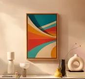 This poster exudes pure retro vibes: dynamic curves in warm orange, red and yellow tones meet calming turquoise and cream - a clear reference to the design of the 70s. The vintage look with a fine patina creates a nostalgic charm and makes the motif a real eye-catcher. Ideal for anyone who wants to bring colour, movement and retro aesthetics into their rooms. Whether in the living room, office or creative area - this picture makes a bold, stylish and therefore timeless statement.