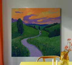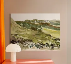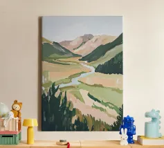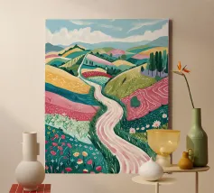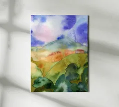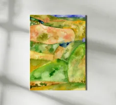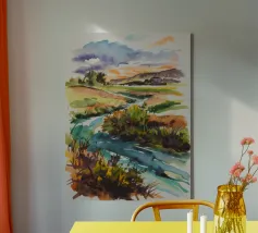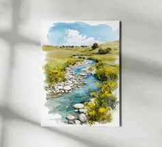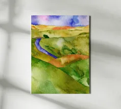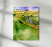 River Path is a serene watercolor landscape that captures the gentle flow of a river winding through sunlit hills. Soft layers of green, yellow, and blue evoke the warmth of summer and the calm rhythm of nature. This artwork radiates peace and harmony — a perfect piece for interiors that embrace light, tranquility, and the beauty of open space.