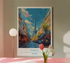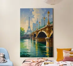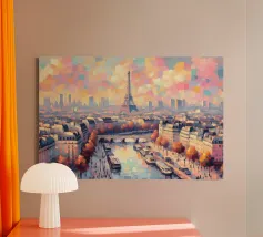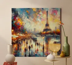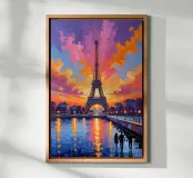 This vibrant impressionist painting captures the Eiffel Tower during twilight, surrounded by a vivid tapestry of colors. Rich purples and oranges dominate the sky, while the tower glows majestically, reflecting beautifully in the Seine. Couples in elegant attire are depicted strolling along the illuminated riverbank, emphasizing the romantic atmosphere. The composition blends expressive brushstrokes with a balanced use of light and color, evoking the essence of Paris as a city of love and artistry. This painting celebrates the iconic landmark as a timeless symbol of romance and culture.