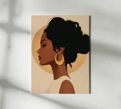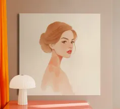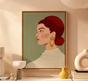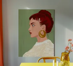 This highly elegant profile portrait showcases a woman with rich, ruby red hair meticulously styled into a bun. Her thoughtful, serene gaze, coupled with a simple gold earring against a soft green background, creates a timeless aura of classic beauty and sophistication.