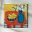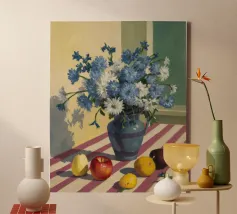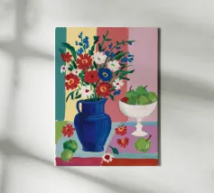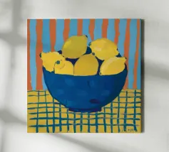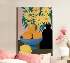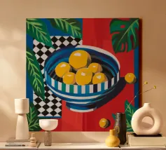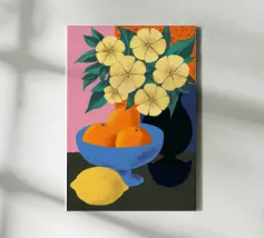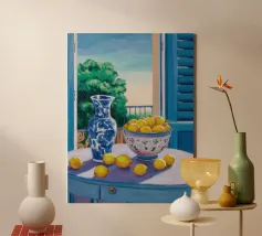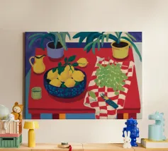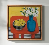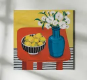 An inviting still life on a bright red table, featuring a bowl of lemons and a blue vase holding delicate white flowers. The warm yellow background enhances the cozy and vibrant atmosphere.