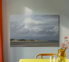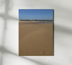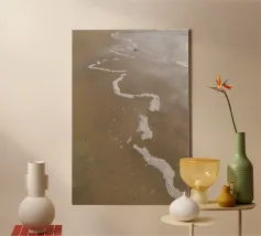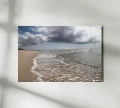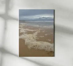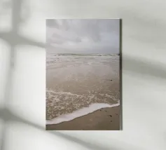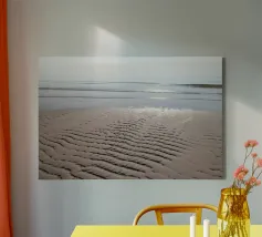 This fine art photo motif shows a wide, deserted sandy beach under a gently overcast sky. The water recedes calmly and leaves wet traces in the sand, capturing the peaceful and meditative mood of the coast. Ideal for lovers of nature photography, sea views and atmospheric murals. Perfect for the living room, bedroom or office.