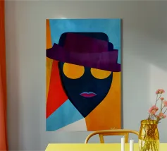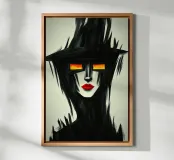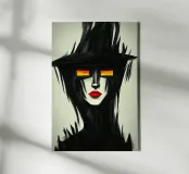 A mysterious face, hidden in dark shadows, with burning eyes that stand out from the darkness. The bold black strokes merge with the background and create an almost ghostly presence. The deep red lips provide a striking contrast and lend the portrait an almost surreal elegance. This work of art draws the viewer into an enigmatic world between light and darkness.