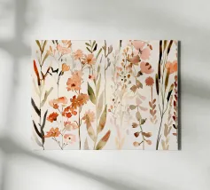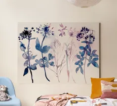 Inky botanicals emerge from soft washes of blush and blue, layering shape and silhouette. A gentle interplay of shadow and structure, where leafy forms unfold like a quiet field sketch in motion.