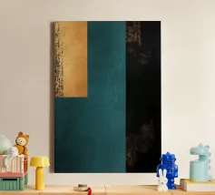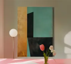 Minimalist painting in the style of white on a beige background, three rectangular colour fields in emerald green and black with gold leaf accents. One field is monochrome and the other two fields have subtle colour gradients. Minimalism, painting.