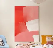 This abstract composition is built around a gentle tension between bold coral-red and softened blush tones, interrupted by a luminous white passage. The colors meet and overlap in broad, painterly blocks, creating a sense of structure without rigidity. The palette remains warm and cohesive, with the white acting as a quiet breath within the field of color.