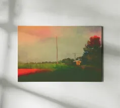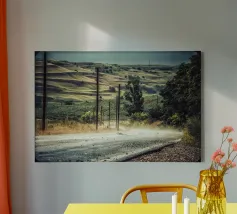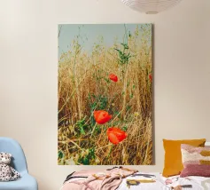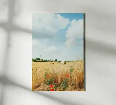 A candid springtime capture taken from a moving train, revealing a Romanian countryside bursting into bloom. Poppies, yellow wildflowers, and a sunlit sky meet power lines and motion blur, blending nature’s renewal with the pulse of modern life. This fine art print speaks of travel, freedom, and fleeting beauty—ideal for eclectic interiors or as a bedroom wall accent with a sense of story.