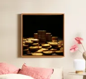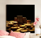 Piles of shiny coins are arranged in varying heights, surrounded by scattered coins, all illuminated against a black background, creating an eye-catching contrast.