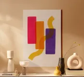 This modern poster combines three upright, coloured bars with a curved line that winds its way through the image. The clear geometry meets organic movement, the colours - pink, orange, yellow and purple - create depth and energy. Ideal for creative rooms, modern living concepts and design lovers who want to combine clear form and lightness.