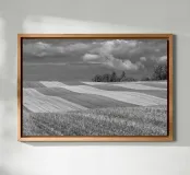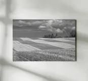 Black and white images of a harvested field. The geometric structure contrasts with the clouds.