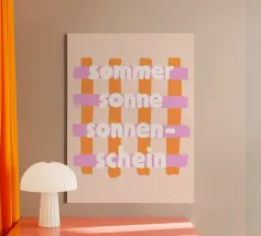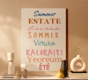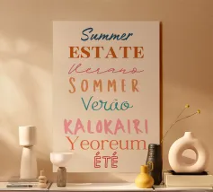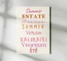 Celebrate the universal joy of the season with this playful typography art print. The design features the word "Summer" written in nine different languages and scripts, including English, Spanish (Verano), German (Sommer), Portuguese (Verão), Japanese (Kalokairi), Korean (Yeoreum), and French (Été), among others. Each word is rendered in a unique font and a vibrant, warm color—from bold block letters to elegant script—giving the piece a dynamic and eclectic feel. The mix of styles and languages makes this a perfect representation of global wanderlust and sunny days. This premium digital poster