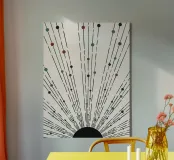 This extraordinary design shows a stylised sun with dynamic rays of fine lines, complemented by coloured dots in green, brown and black. The minimalist aesthetic and soft colour palette make this motif ideal for murals, cushions, mugs and other home accessories. It brings a modern and calming atmosphere to any room and is perfect for lovers of boho and Scandinavian style as well as anyone who appreciates art and design.