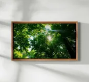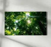 Sunlight filtering through dense green trees in calm canvas