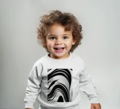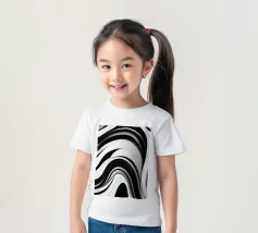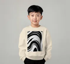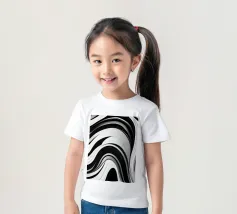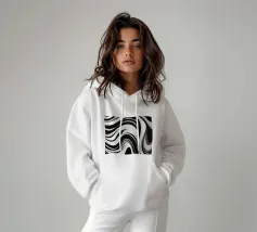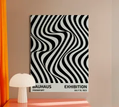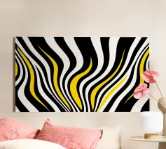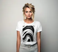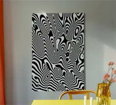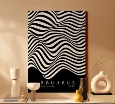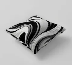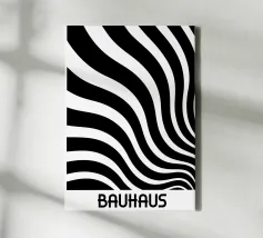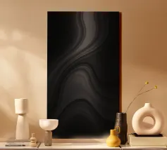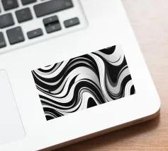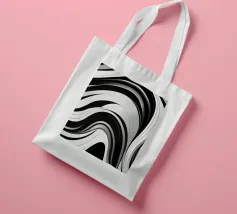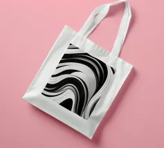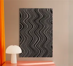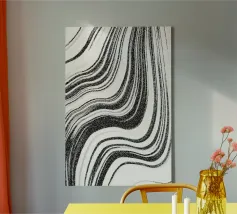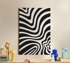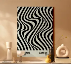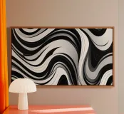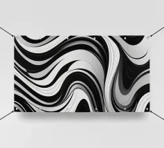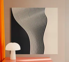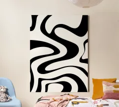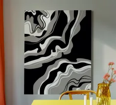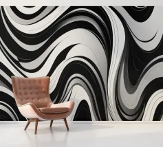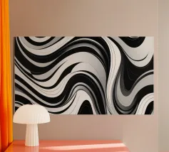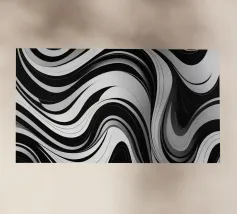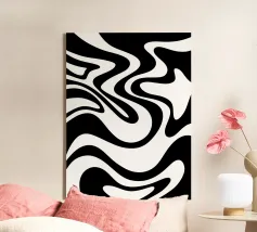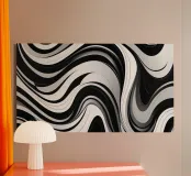 The composition features flowing black and white patterns with soft curves that evoke a sense of rhythm and fluidity, enhancing the visual experience with its dynamic appeal.