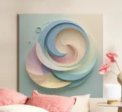 Intricate spiral shapes in soft pastels blend harmoniously, giving the illusion of flowing motion against a pale backdrop. The design captivates with its gentle curves.