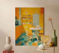 A vibrant patchwork kitchen with yellow table, tea set, and art bursts with domestic color.