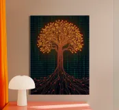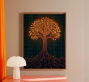 An entrancing, neon-lit depiction of a tree where every branch and leaf is a glowing circuit board. Its intricate, sprawling roots connect to a dark, stylized soil, while the background is filled with streams of cascading green binary code, blending nature with technology. This piece masterfully symbolizes the intertwined relationship between organic life and the digital world, perfect for anyone who appreciates the aesthetics of technology, cyberpunk, or abstract art.