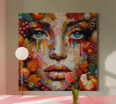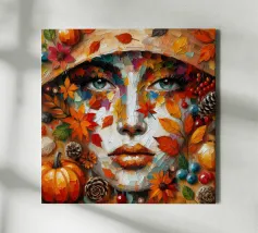 Acrylic painting of a woman's face during the Autumn and Fall season. Featuring leaves, pumpkin, acorns and berries.