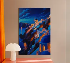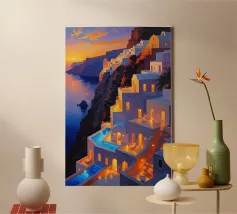 Experience the breathtaking allure of Santorini's iconic whitewashed architecture as it basks in the warm, golden glow of twilight. Nestled on the edge of the caldera, the domed roofs and cascading buildings are illuminated against a serene Aegean Sea backdrop. The dramatic interplay of light and shadow enhances the scene, while the clear evening sky transitions into deeper hues. This enchanting view captures the timeless charm and tranquility of one of the world's most romantic destinations, evoking a sense of wonder and escape.
