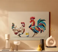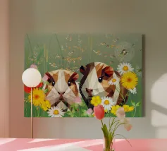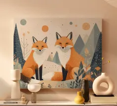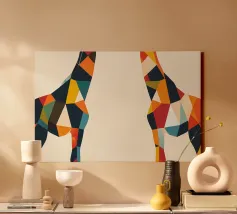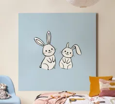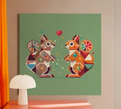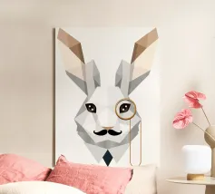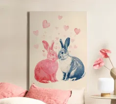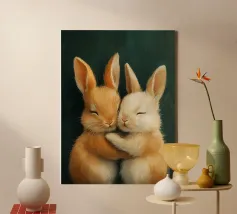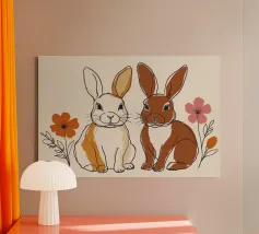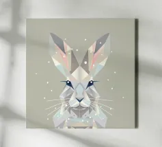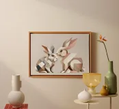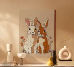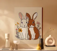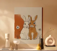 Two rabbits in soft, geometric shapes and calming earthy tones. Their depiction in different shades of brown adds a playful yet elegant touch. A perfect work of art that epitomises the mood of spring and the joy of the season. Geometric depiction of two rabbits Harmonious earthy tones in beige, brown and white Ideal for spring themes and Easter decorations Modern design with a minimalist touch Perfect for art lovers who appreciate creative depictions of animals