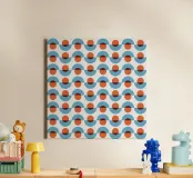 A repetitive geometric pattern features alternating rows of semicircles and circles in blue and rust colors against a light background. The design creates a sense of rhythm and movement through its symmetrical arrangement.