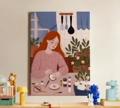 This artwork shows a person with blonde hair looking into a vanity mirror. The background is filled with floral wallpaper, and the vanity table is adorned with various items, creating a nostalgic and intimate scene.