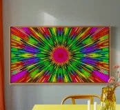 A captivating artwork features a central radial burst of vivid colors including pink, green, and purple. This abstract design creates a striking visual experience suitable for various artistic uses.