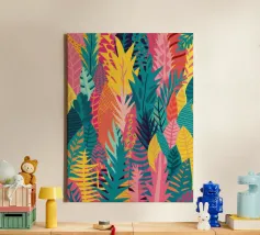 A dense, colorful pattern of overlapping tropical leaves and abstract shapes in bright hues of yellow, pink, blue, and green, creating a joyful, energetic design.