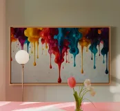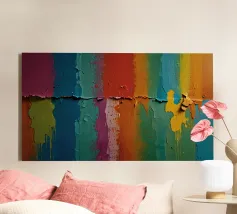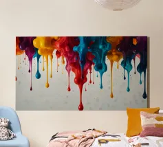 A striking array of colorful paint drips flows down against a white backdrop, showcasing vibrant reds, blues, yellows, and purples. The variety of shades creates a mesmerizing effect.