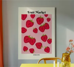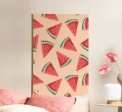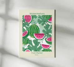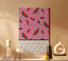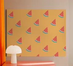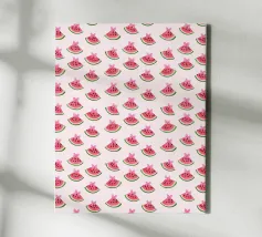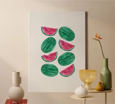 This refreshing digital poster features a playful, repeating pattern of vibrant watermelon slices. Each slice is depicted with juicy red flesh, dark seeds, and a crisp green rind, all scattered across a soft, pale peach background. The cheerful colors and repetitive motif create a fun, summery, and pop art aesthetic. This high-quality digital poster, offered at 7000x5000 pixels and 300 dpi, brings excellent art and a joyful, fresh vibe to any space.