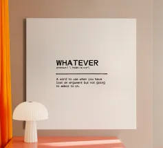 Transform your space with this striking canvas featuring the bold statement "Whatever" by creative genius Sebastian Hilgetag. Perfect for modern interiors, it combines artistic flair with a touch of urban sophistication. Ideal for your living room, office, or any area that needs a touch of personality, this piece serves as both a conversation starter and a stylish accent. Its sleek design and monochrome palette effortlessly blend with various decor styles, making it a versatile choice for anyone looking to enhance their environment. Whether you're an art aficionado or just starting your collection, this canvas will make a bold impression. Get ready to elevate your aesthetic with this contemporary artwork that speaks volumes without saying much at all!
