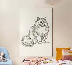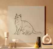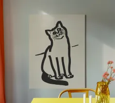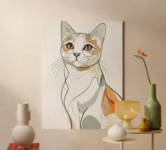 White cat sitting with alert expression in a minimalist art canvas