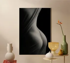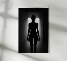 A woman poses with her back turned, showcasing the contours of her spine and shoulder blades. The black and white tones enhance the beauty of her silhouette and create an artistic atmosphere.
